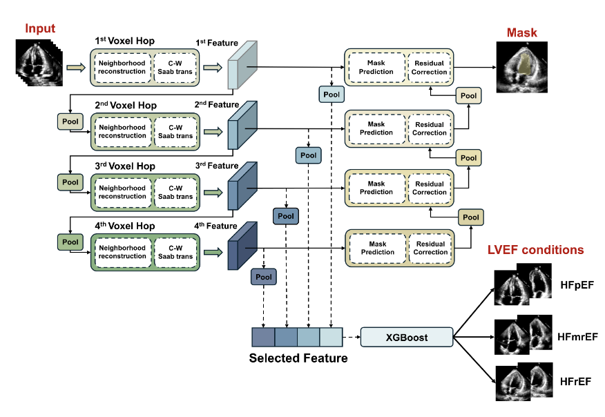 This paper proposes a backpropagation-free Multi-Task Green Learning framework that combines an unsupervised VoxelHop encoder with an XGBoost classifier to perform simultaneous LV segmentation and LVEF classification from echocardiography.