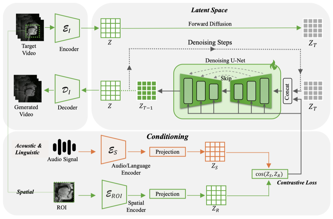 We propose a generative framework that synthesizes anatomically accurate vocal tract MRI sequences directly from speech audio using Whisper’s audio-language representations and region-of-interest alignment, enabling simulation of speech-driven anatomical motion without direct MRI acquisition.