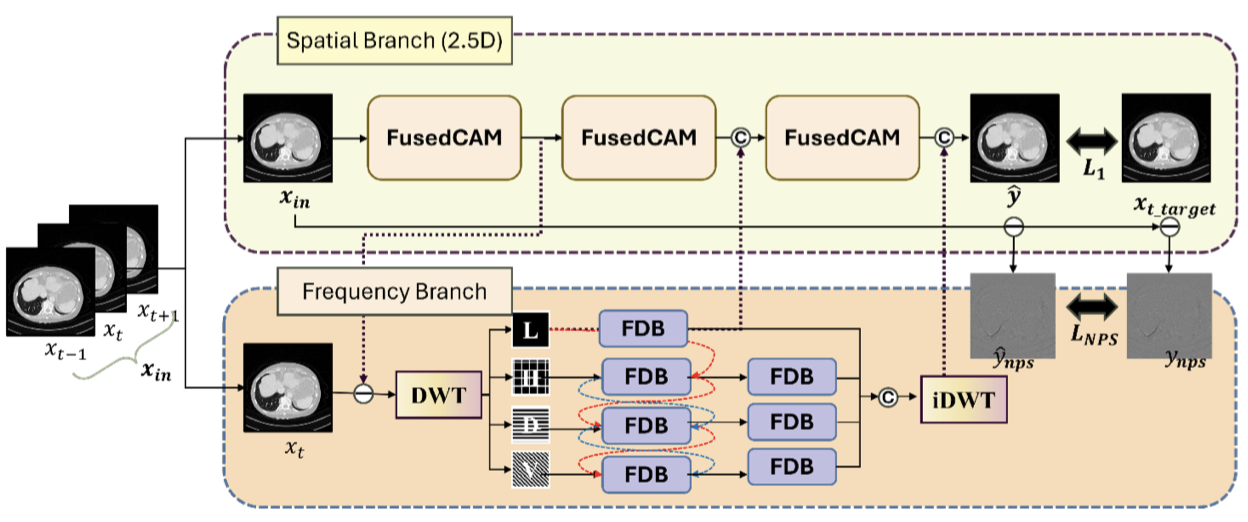 We propose a dual-branch deep learning framework for denoising low-dose CT images while preserving fine textures. The model combines a low-frequency suppression branch and a high-frequency detail recovery branch, utilizing Discrete Wavelet Transform and cross-directional feature fusion. Evaluated on the NIH-AAPM-Mayo Clinic dataset, our method outperforms existing techniques in both noise reduction and texture preservation